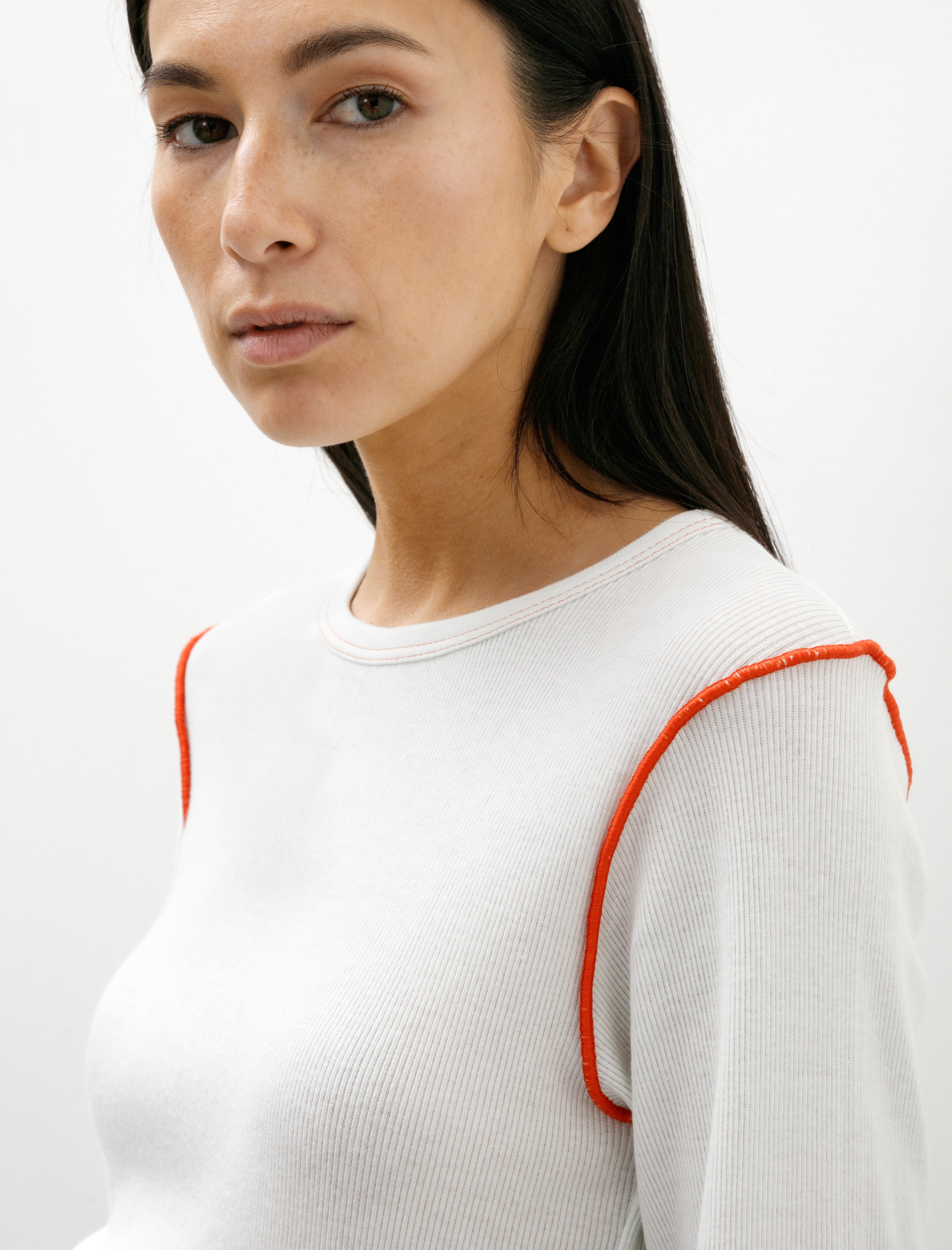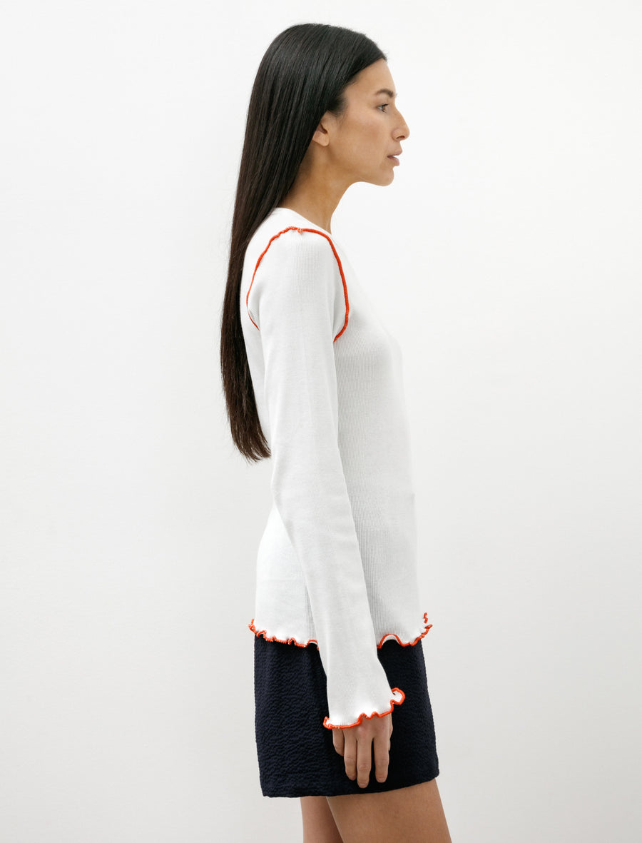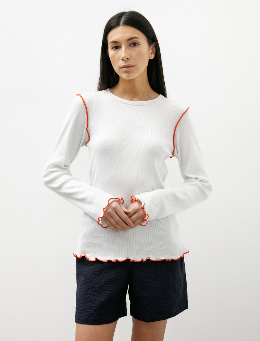 A charming take on an everyday staple, this long sleeve tee from Howlin’ will have you reaching for it all year round. Made of the brand’s signature fine rib cotton, it has an incredibly soft hand that feels buttery soft against the skin. The off-white colour pairs perfectly with the red trim detailing for a nostalgic feel. Dainty lettuce edge detailing at the sleeves and hem adds a subtle feminine touch. Made to be worn on repeat, this top is an easy addition to any outfit rotation.