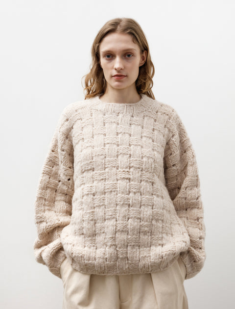 A luxurious sweater to cozy up with in the cooler seasons. Hand knit from an ultra soft lofty yarn of baby alpaca, merino wool and cotton, it has a thick and buttery smooth hand. Intricate, weaved construction creates a unique, open texture that allows you to play with layering. It has a roomy fit, making it the perfect companion for a casual day on the town. The versatile, neutral colour gives you the option to pair it with virtually any bottoms whether you choose to wear it with your favourite denim or to soften an elegant skirt.