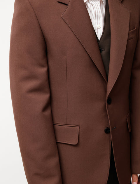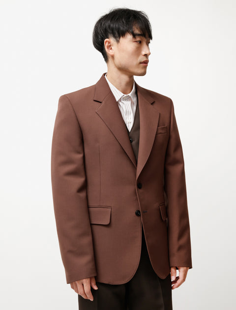 Slim fit single-breasted blazer made of Lemaire's signature poly-wool blend fabric. The jacket features structured shoulders, darting in the front and back for a tailored look, two front flap pockets, a chest welt pocket, a large lapel collar, a single back vent, corozo nut buttons and it is fully lined.