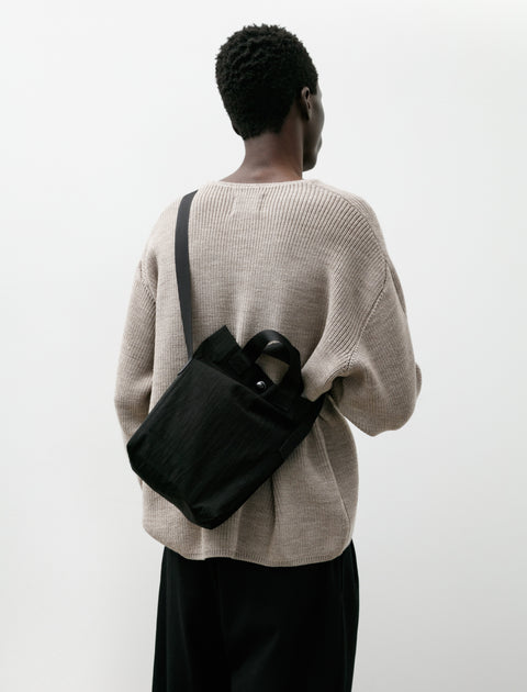 A newly introduced, miniature version of MAN-TLE's signature tote bag cut from their trademark, heat treated nylon cloth. Features the signature pull-toggle closure originally designed for convertible soft tops, dual carry handles at the top, and a single longer strap that can be worn on the shoulder or cross body. The smaller size is well suited to small valuables that are best kept close or for short trips around town. Constructed with reinforcement discs at handle attachment points and french seams for a hard wearing finish that is built to last.