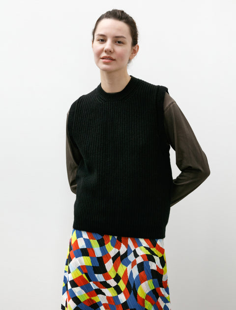 Simple yet refined, this black sweater vest from Margaret Howell is a wardrobe classic. Knitted from a soft, fine merino wool, it has a clean crew neckline and a relaxed silhouette that layers effortlessly over shirts or dresses. Ribbing throughout with thinner ribbed trims lends subtle structure, while the minimalist design allows the craftsmanship and texture to take centre stage. A timeless wardrobe essential that embodies quiet sophistication.