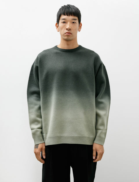 An easy, relaxed fitting, boxy, crew neck sweater knit from a fine all wool yarn with a felted finish in an ombre-green treatment. Roomy yet controlled proportions through the chest and shoulders meet with tapered sleeves to produce dynamic volume through the sides that moves with dense, plush drape. Constructed using full-fashion knit panels for a long lasting shape that minimizes waste in production.