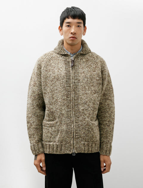 A generous, lightly oversized, heavyweight hand-knit Cowichan sweater in a chunky, green/beige/brown melange yarn blending lambswool with yak wool. Features a large double knit shawl collar, hand pockets at the waist, and a two-way Waldes zipper with a brown leather zipper pull. Raglan sleeves offer natural drape at the shoulder that combines with the remarkable density achieved through hand knitting for a plush, structured silhouette. Constructed as a single piece with darted seams to for the shoulders, minimizing inner seam bulk while maximizing longevity.