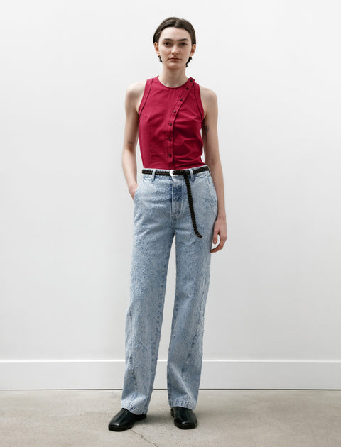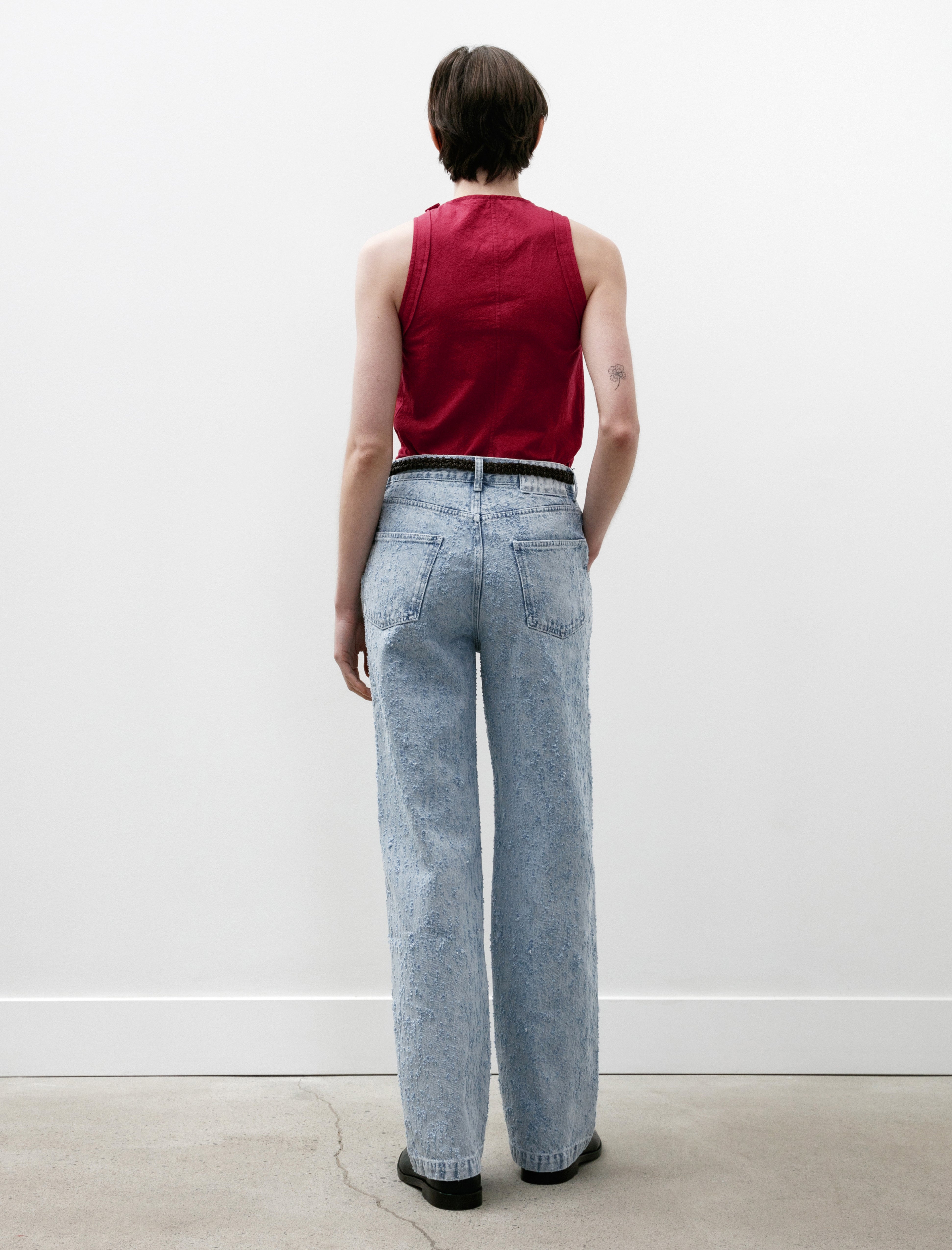 Make a subtle statement with these distressed twisted seam jeans from Mfpen. Made from an organic cotton denim in a light blue wash, they have a relaxed straight fit with a medium rise. The unique all over distressing pattern is done with a laser for a precise appearance. Complete with side pockets, rear patch pockets and twisted side seams up the legs, these jeans may just become your new go-to pair.
