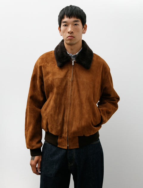A relaxed fitting, cropped, zip-front blouson cut from carefully selected, supple goat suede in a rich, warm tobacco brown. Features a detachable wool shearling collar, a matte finished Riri zipper, welted hand pockets at the waist, ribbed cuffs, and a ribbed hem. The truncated, bloused silhouette calls to mind classic flight jackets while the texture and softness of the suede impart an innate elegance. Constructed with a full lining in a super fine cupro satin including an inner left breast pocket for a long lasting, fully encased finish; horn buttons at the collar.