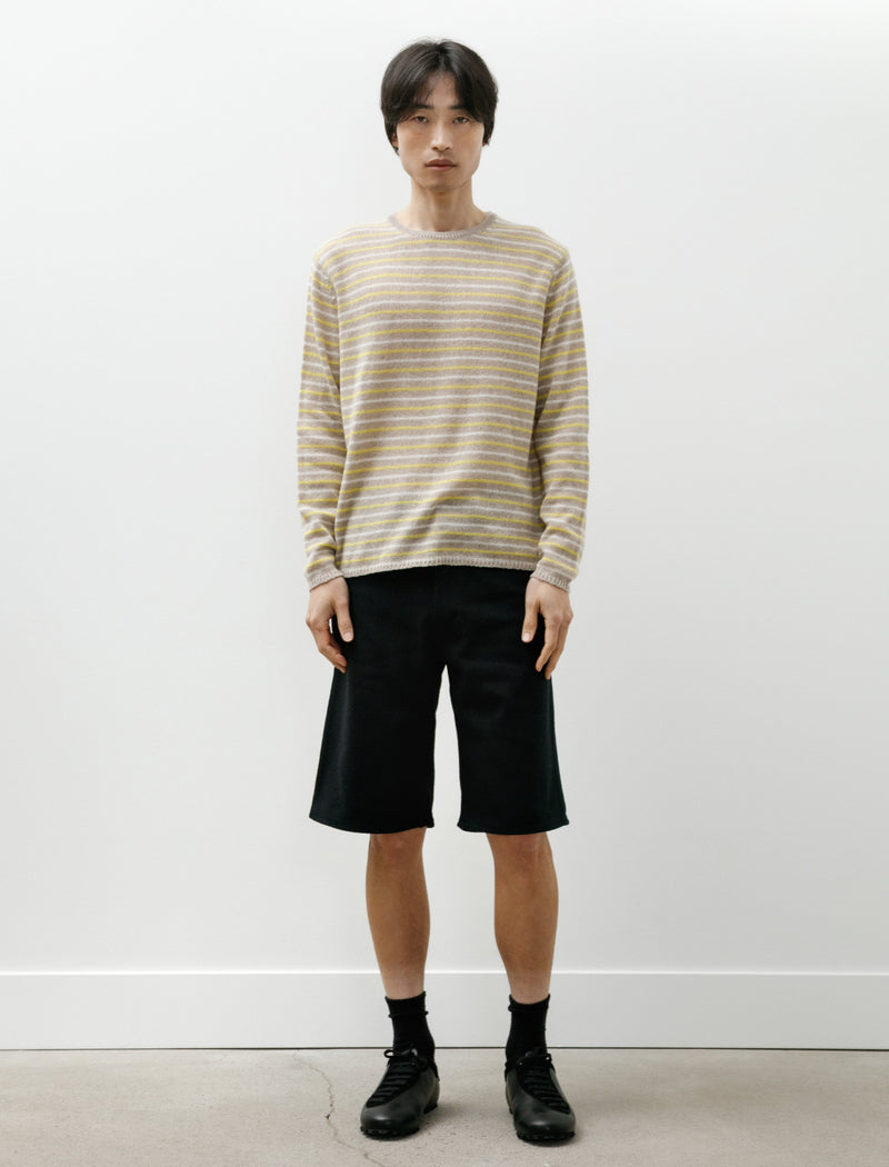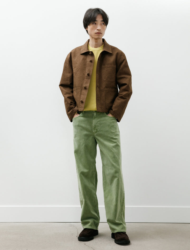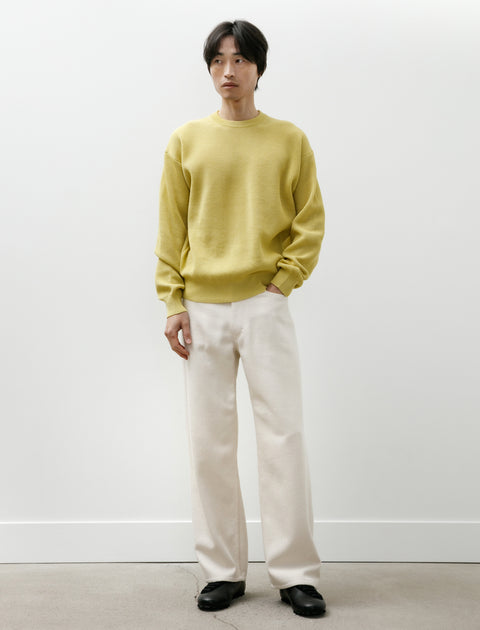 Wide fitting, straight legged pants cut from a plush, midweight, silk nep denim with a pronounced ridged texture in ivory white. Feature a Waldes zip fly, a tack button closure, and classic five pocket styling with a right-hand ticket pocket and rear patch pockets. Straight cut proportions from the hip to the hem produce a mild column-like silhouette that falls slightly away from the body with a sense of weighty, soft drape. Constructed using flat felled seams through the seat and inseam for added durability at high wear points.
