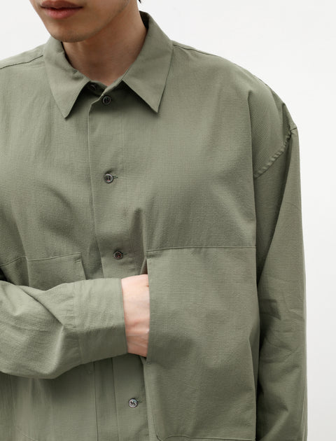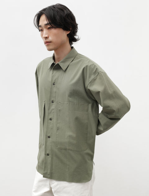 A lightweight, oversized shirt jacket cut from a slubby, soft cotton micro ripstop in a washed olive. Features a classic shirt collar, side entry front patch chest pockets, a two piece clean finished yoke with a generous inverted box pleat, and split side seams. A flat cut hem with curved corners evokes a traditional Japanese style that is contrasted nicely by the additional ease through the back and shoulder. Constructed with flat felled seams throughout for a long lasting, durable finish.