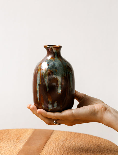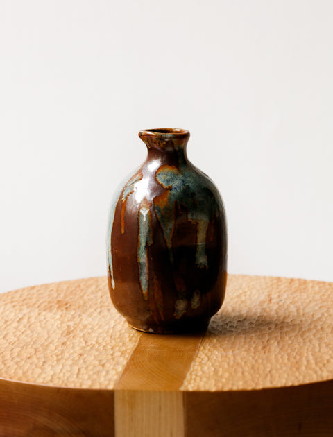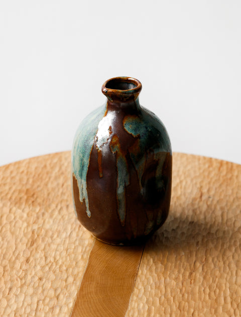 A gorgeous little pitcher with an enigmatic spill of glaze. The perfect size for sake or other liqueurs, or to use as a vase. It has dimples on either side that fit the hand for a perfect pour.