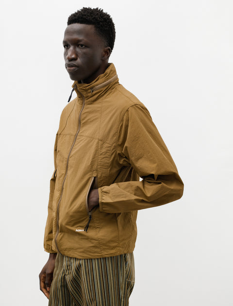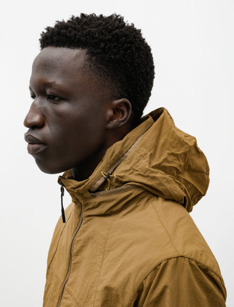 A classic fitting tech style zip front jacket cut from a high density nylon plain weave in coyote brown. Features a stand collar, a stowable concealed hood with elastic adjusters, two front pockets with zip closures, and an elastic hem adjuster. Underarm is cut with a large circumference to improve range of motion through the shoulder, panelled construction allows for subtle shaping throughout; gently elasticated cuffs. Durably constructed with french seams for a hard wearing finish that will last many years to come.
