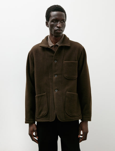 Evan Kinori's signature, longstanding button-front jacket cut from a heavy wool/cotton blanket cloth in a deep olive green. Features a spread collar with rounded tips, a left breast pocket, hand pockets at the waist, a cutaway profile closure, and engineer's cuffs. Relaxed proportions throughout offer a timeless silhouette with a sense of sophisticated utility while allowing the blanket cloth to express its unique drape. Constructed using french seams throughout for a long lasting, encased finish; leather washer backed YKK tack buttons throughout.