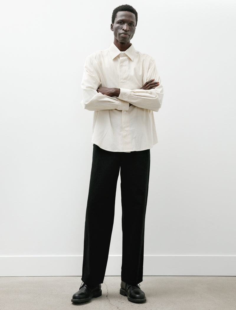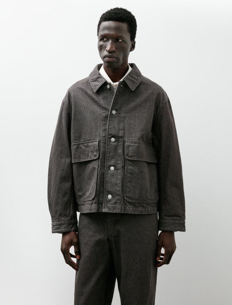 A newly introduced, cropped zip-front jacket cut from a heavy, upholstery weight, Belgian linen canvas in black. Features a sharply pointed collar, a two-way Waldes zipper, welted hand pockets at the waist, a yoked back, an elasticated hem, and engineer's style cuffs. Wide proportions through the body taper subtly to the waist, producing bloused volume through the back that complemented by additional volume at the cuffs. Constructed with a full lining in a fine cotton poplin including two inner chest pockets for a long lasting, encased finish.