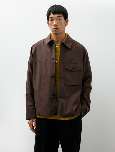 A relaxed fitting, boxy, button front overshirt cut from GoreTex® Windstopper in a deep chocolate brown. Features a classic collar, on-seam hand pockets at the waist, a pleated left breast pocket, a yoked back with pleats at the shoulders, and snap fastening waist cinches at the hips. The Windstopper offers excellent protection in windy conditions and mild water resistance suitable for protection in light rain while the roomy cut offers a timeless utilitarian edge. Constructed with a full lining in a blended wool flannel, providing light insulation and an encased finish.