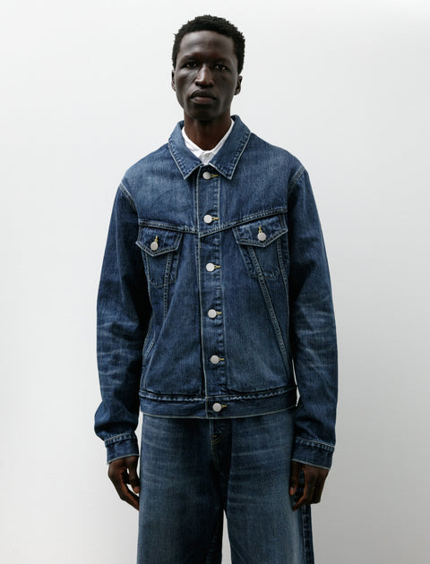 A trim, relaxed fitting, denim jacket cut from a dense, washed cotton denim in faded indigo. Features a classic collar, button-closure breast pockets, on-seam hand pockets at the waist, and button fastening waist cinches. Outward sloping front darts and a rolled shoulder seam produce a unique bagged silhouette that sits with volume concentrated at the front; tailored sleeves offer composed elegant stance. Constructed using chain stitched flat felled seam at points of high stress for added durability; matte nickel tack buttons and rivet reinforcements throughout.