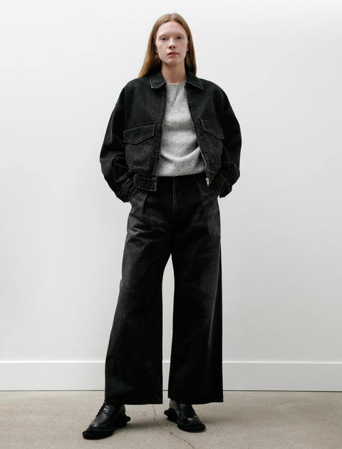 The only denim jacket you will ever need. Made from a soft selvedge denim in a faded black wash, it has a perfectly oversized and slightly cropped fit. Taking inspiration from traditional workwear, it has a classic collar, large front pockets, tabbed waist cinches and pleated cuffs. The voluminous silhouette through the body is complimented by roomy sleeves with dropped shoulders. The utilitarian detailing pairs perfectly with the elegant drape of the fabric to create a denim jacket that will stand the test of time.
