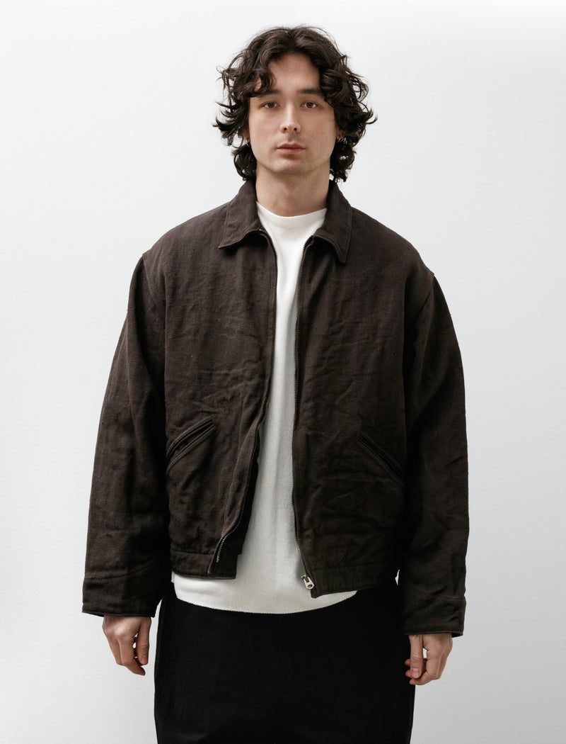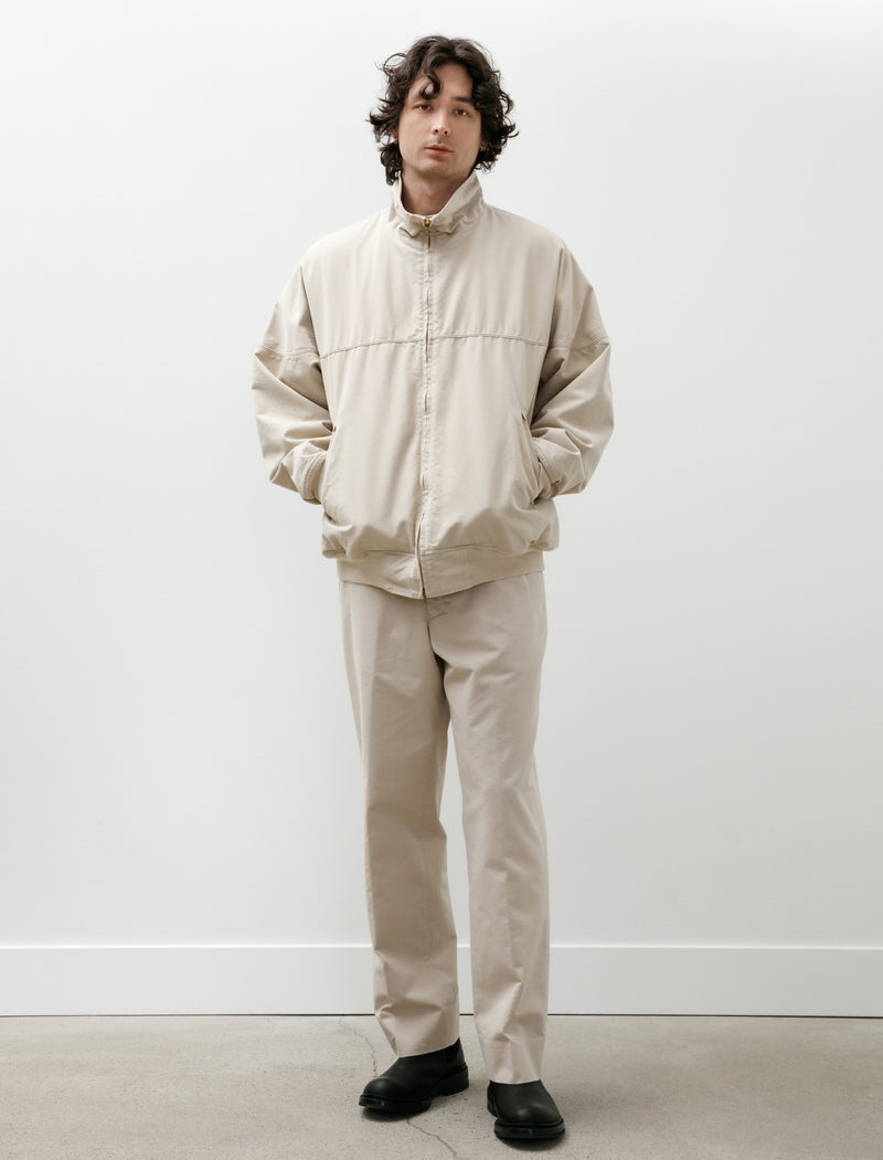 Wide fitting classic work pants cut from a high density, fine blended chino twill in ivory. Feature a zip fly, a sliding hook closure, a "prong keeper" loop at the closure, front slash pockets, and rear welt pockets. Straight cut proportions throughout the silhouette offer a mild column-like stance while the creased leg lends a sense of elegant utility. Constructed with a split waistband and blind hems that can each be let out if added volume or length is desired; completed with wide utility-style belt loops.