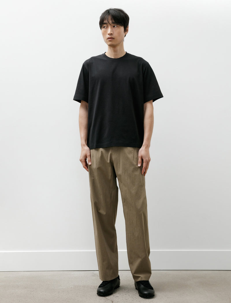 Wide fitting technical cargo pants cut from a lightweight stretch nylon poplin in a warm grey tinged beige. Feature a sliding snap closure, a zip fly, front slash pockets, integrated rear pockets attached at the yoke, two zip-closure thigh pockets, and snap-fastening tabbed waist cinches. Ergonomic panelled construction provides subtle shaping and a highly accommodating fit to produce a streamlined technical silhouette that offers unrestricted range of motion. Constructed using taped seams and bonded hemming throughout for a low profile finish that offers mild weather resistance.