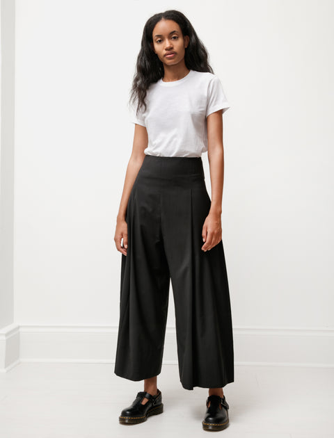 These pants are made from light tropical wool that’s smooth to touch and drapes beautifully with ease. Deep front and back pleats ascend from their ultra high-waist band, creating volume through the hips. Finished with a concealed zip closure at the side for minimal interference with their unique shape.