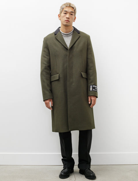 A roomy, elegant, darted dress coat cut from a heavy, dense wool melton in a deep olive green. Features a contrasting collar, a notch lapel with a high break point, a covered fly front placket, flapped welt pockets at the waist, functional surgeon's cuffs, and a hand stitched logo patch at the left wrist. Front darting creates subtle elegant shaping to provide a gentle flare through the silhouette with ample wearing ease provided by a generous rear vent pleat. Finished with a full lining in a black, jacquard logo satin complete with internal breast pockets.
