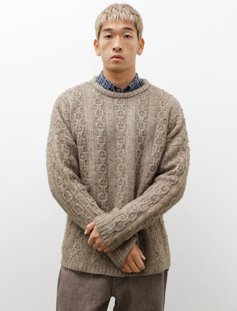 A relaxed fitting slouchy cable knit pullover knit from a blended wool/acrylic yarn in a dusty greenish beige with a pilled surface throughout. Cut with a wide body and a dropped shoulder to provide a roomy chest that easily accommodates under layers without the need for an excessively roomy sleeve or armhole. Constructed using knit linked seams throughout for a more long lasting shape that is resistant to warping over time.