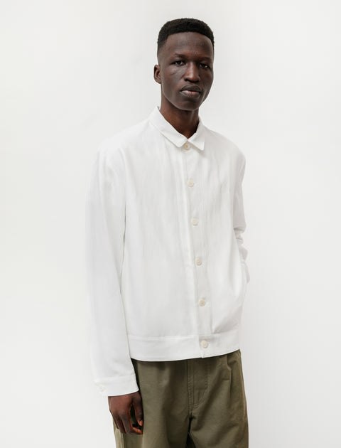 This relaxed fitting work jacket is cut from a blend of natural and synthetic fibers, offered in a stark white. Features include double layered front body construction, button closure placket, single buttoned cuffs, pockets at side seams, and an inner chest pocket.