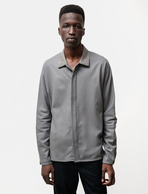 A style that can be worn alone or as an overshirt. An interesting three quarter sleeve construction exhibits the Belgian designer's modern nuances in tailoring. Constructed from a fine flannel blend, the narrow collar is cut from a tonal faux suede that offers subtle contrast and texture. Finishing details include a hidden button placket and a straight hem with side vents.
