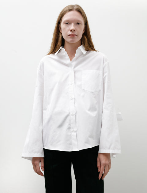 Simple sophistication with a romantic touch, this shirt is Cecile Bahnsen’s take on a classic button-up. Made of a light and crisp white cotton fabric, it has a smooth hand and easy drape. The silhouette is straight through the body with classic shirting elements like a collar, chest pocket, and button-up front that are perfectly contrasted by the wide sleeves with large bow details at the back for a touch of whimsy.
