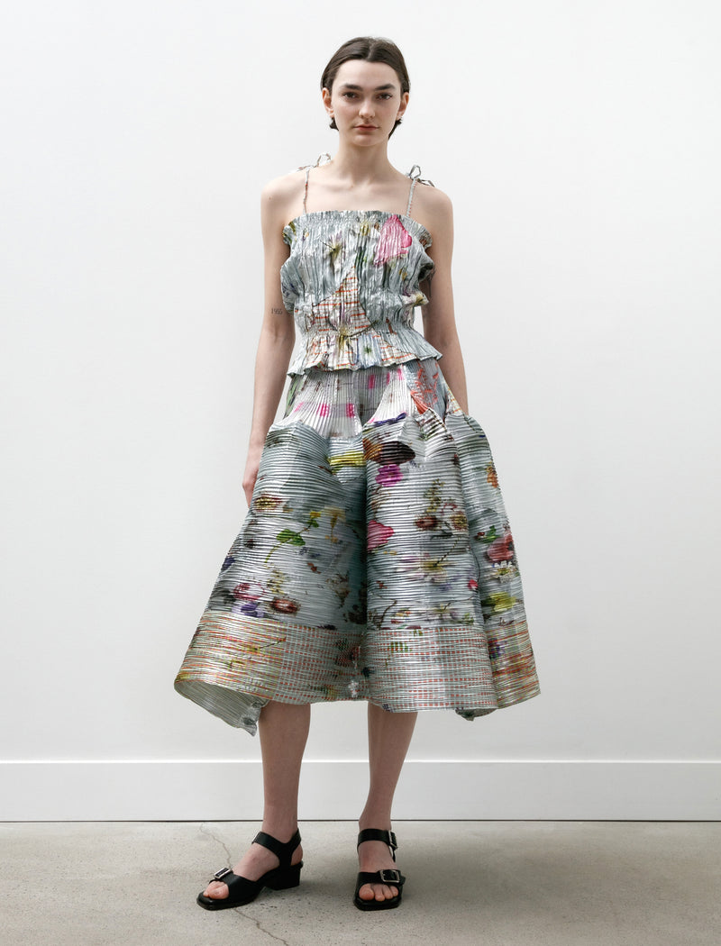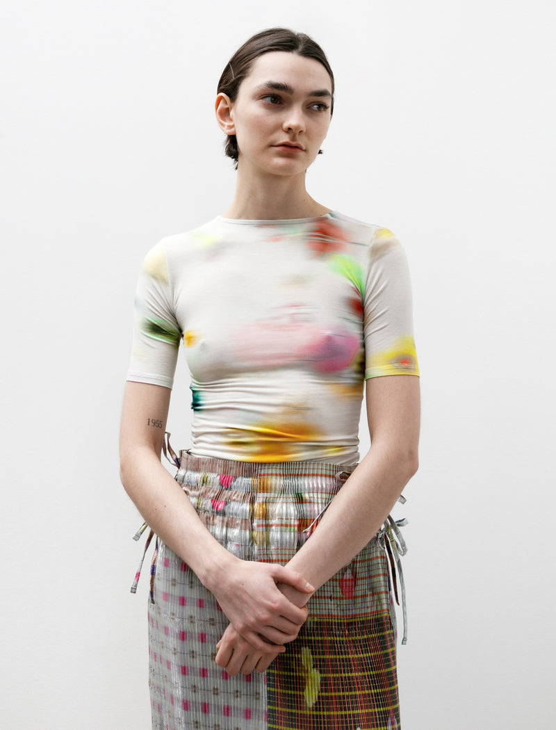 A slim fitting long sleeve with an other-worldly print . Made from a lightweight, subtly sheer fabric, it showcases traditional Shibori pleating techniques that are all done by hand. It has elongated sleeves and a wide, high neckline for added elegance. A stunning multicoloured pattern on a dark background has been designed in house to ensure exclusivity. A breeze to style, this top can be dressed up with an elegant skirt, or wear it more casually with your favourite trousers.