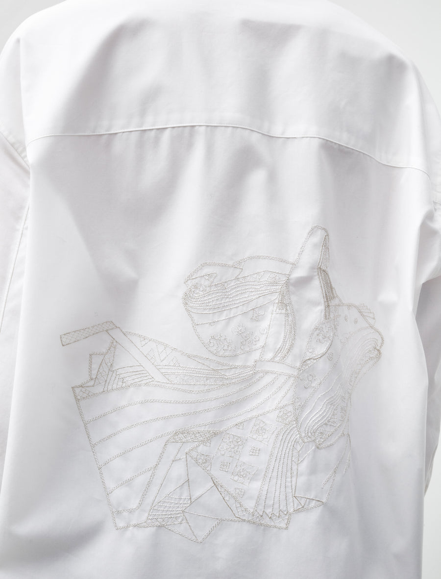A classic white button-up shirt with a unique twist. Made from a crisp cotton fabric, it feels airy and lightweight, making it an ideal shirt year-round. It has timeless elements like a classic collar, buttoned cuffs, and a curved hem that blend seamlessly with the modern touch of a concealed button placket. The main attraction of this shirt is the large Japanese design embroidered at the back in a glittery silver thread that shines when hitting the light just right. A perfect pairing with some sophisticated trousers for a put-together look, or you can unbutton it and throw it on top of a simple tee and shorts for a casual approach.