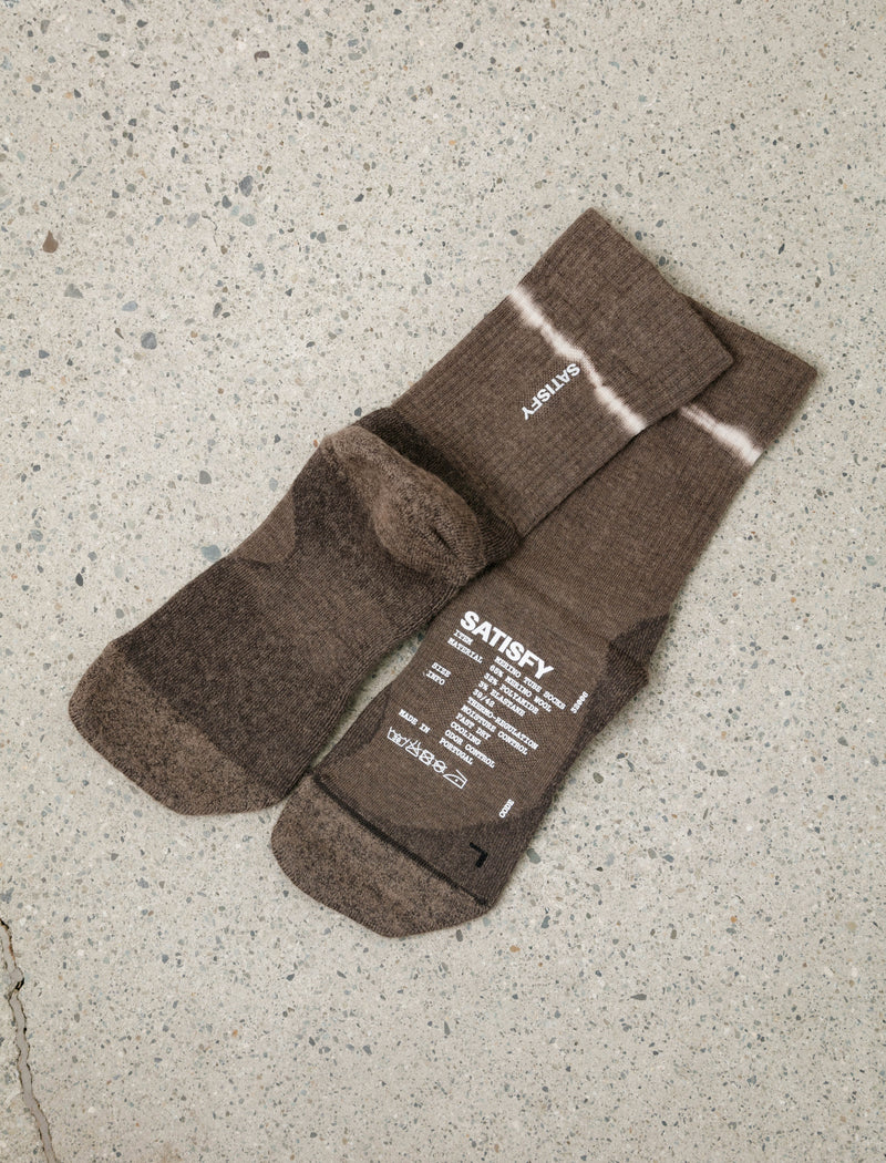 An updated iteration of Satisfy's signature Merino tube socks knit from a highly durable merino/nylon blend tie dyed to a vibrant green. This version features a slightly lighter cushion at the footbed, reducing bulk to enhance mapped construction and optimize cooling throughout. Completed with a reflective Satisfy logo print at the calf for improved visibility in dark conditions.