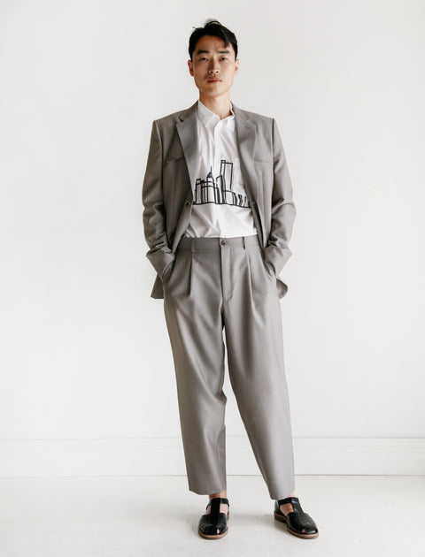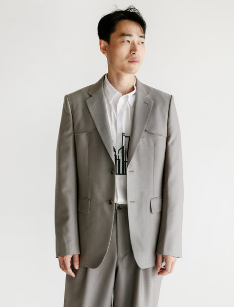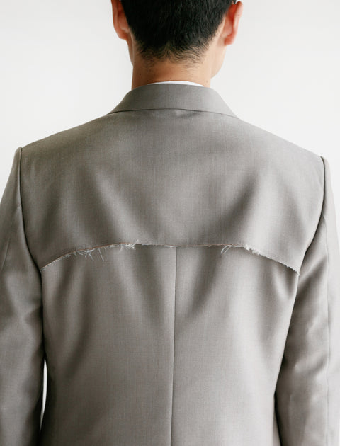 Experimental tailoring as only Comme des Garçons knows how. This 2 button suit jacket is produced in worsted "sharkskin" wool-mohair blend - appropriate for four season wear. Its striking detail is featured in an exposed yoke panel, revealing raw edges at shoulder. Tapered body fits small. Details include notch lapels, 4 button cuffs and double vent rear.