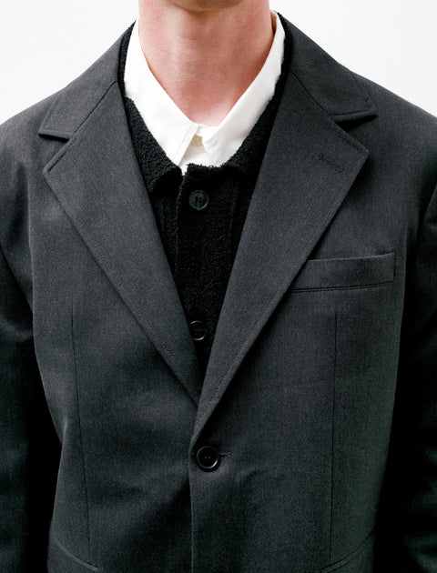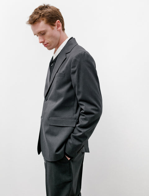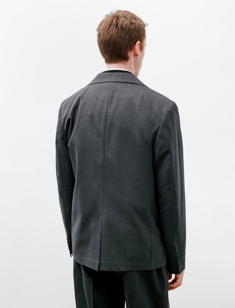 A relaxed, two button, single-breasted blazer cut from blended, worsted wool gabardine in dark grey. Features a wide standing, notched lapel, a welted breast pocket at the left side, and welted flap pockets at the waist. The vent pleat at back eliminates pull and provides a range of motion. Partially lined body with fully lined sleeves in contrasting black cupro; three internal welted pockets. Fisheye darts at front, and light padding at the shoulders provide subtle shaping while maintaining a relaxed silhouette.