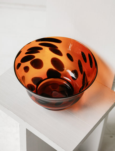 A large serving bowl from bowl glass spotted like an ocelot. Large and slightly antique in shape, it's completely modern in appeal.