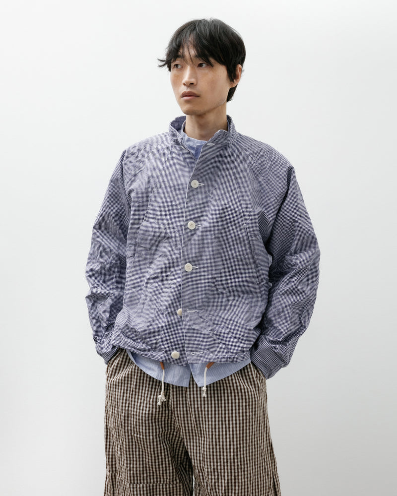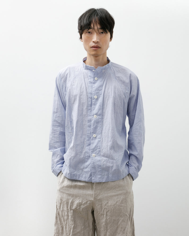 A tailored, cropped, shaped button-front shirt cut from a washed, crisp, cotton/linen/wool Kelsch cloth in a white-on-black check. Features a standless collar, barrel cuffs, Unkruid's signature curved sleeves, and a gently curved hem. Inset panels at the sides meet the front and back at curved "corset" seam lines, combining with horizontal fisheye "pinch" darts to create a highly nuanced silhouette that sits slightly closer to the body through the chest, but expands gently at the hem. Constructed using fine, single needle felled seams throughout for a long lasting, encased finish; Corozo buttons throughout.