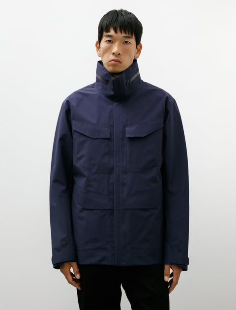 Veilance's flagship, utility hard shell jacket cut from an updated GoreTex® Pro, using a non-PFAS EPE coating, in a rich navy blue. Features a stand collar with a stowable hood, a waterproof YKK zipper, inlaid flap closure chest pockets, dual entry hand pockets at the waist with zipped sides and flapped tops, and velcro cuff cinches. This updated edition of the Field Jacket features a looser, more accommodating fit that is ideally suited to winter layering and preserves Veilance's signature ergonomic fitting for superb comfort in motion. Constructed with a fully seam taped interior to preserve waterproofness and minimize internal bulk.