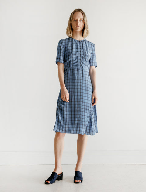 A perfect summer dress in a clear pool blue. Classically fit and hitting just above the knee, this dress looks like rippling water with the ruching on the soft cupro fabric.