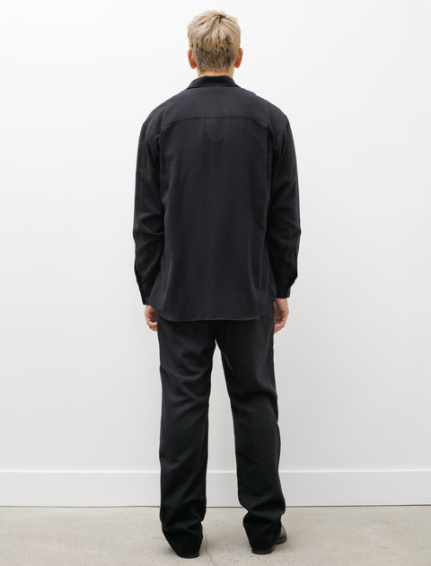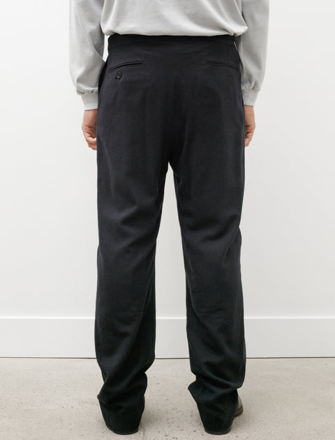 Relaxed fitting drawstring pants cut from an airy, exceptionally soft wool flannel in a dark shade of navy. Feature a unique closure that replaces a top button with a pronounced ribbon style drawstring, front slash pockets, and rear welted pockets. With a slight taper, the leg flows elegantly from the hips to create a dynamic easy silhouette that moves well. Finished with a partial lining in black cupro to improve wearing comfort while simultaneously improving abrasion resistance through the seat.