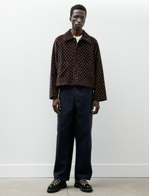Wide fitting tear-away track pants with a gentle taper cut from a dense, soft cotton twill in navy blue. Feature a button fly, front on-seam pockets, a single rear right-hand pocket, and silver tone snaps running the length of each leg with horseshoe embossing. Paying homage to classic 80's athletic wear, the easy cut offers a highly accommodating fit while the finer fabric offers a modern touch. Completed with tonal logo embroidery at the left thigh.