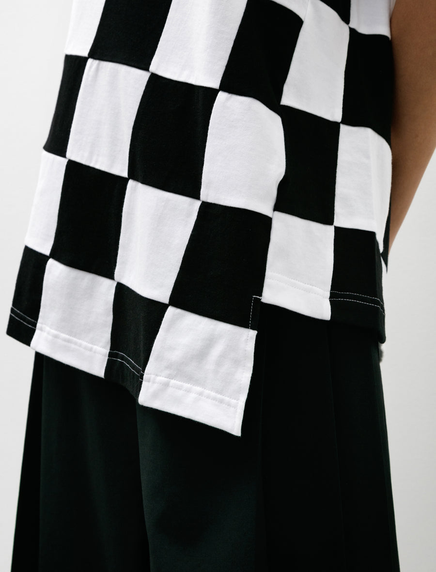 Not just any everyday tee, this top is full of unique charm. Squares of black and white cotton fabric are sewn together in a slightly diagonal pattern to create a playful, twisted appearance. The silhouette is straight through the body for a relaxed feel, while an asymmetrical hem detail at the front and back gives it that final touch of something special. Perfect for casual dressing without being boring or to soften a more formal look with an elegant skirt.
