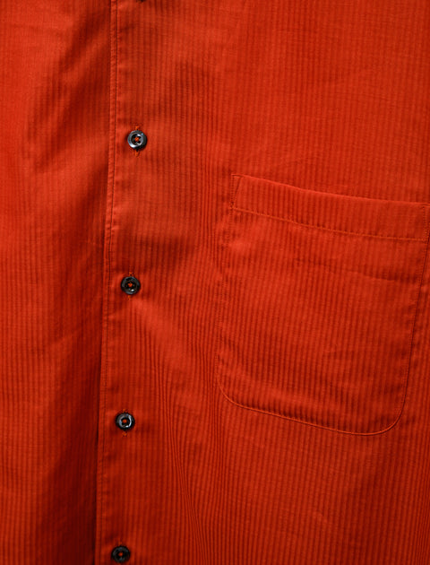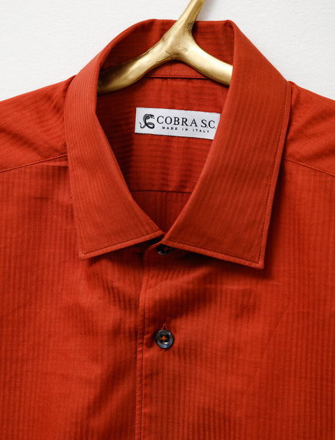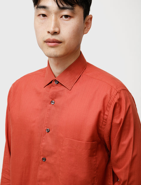 The Replica shirt has a relaxed fit and fuller through the body. Produced in a rust jacquard stripe, the shirt has a soft feel and exquisite drape. Details include a structured spread collar, rounded chest pocket and plain front, wide-set placket. Its hem is curved and has a longer back tail.