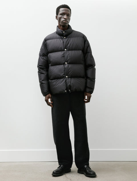 Wide fitting easy pants cut from a plush, heavy, felted wool jersey in a deep charcoal melange. Feature an elastic waist with an internal drawstring, front slash pockets, rear on-seam pockets at the yoke, and drawstrings at the hems. Generous proportions through the seat and thigh offer comfort and volume while a gentle taper from the knee provides control and encourages movement through the silhouette. Cinching the ankles further accentuates the tapered effect and creates a soft, plushly structured balloon silhouette.