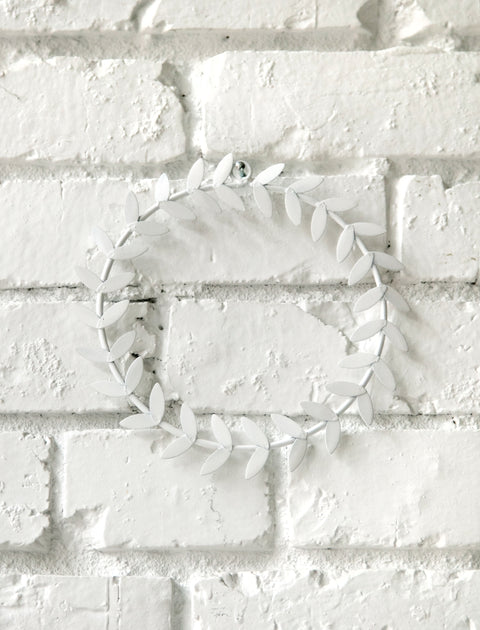 A darling little metal wreath with a timeless design that goes beyond just the holiday season. Made of iron, it is easy to pin up on a door or to tie up as an ornament. A simple way to add some subtle charm to your space.