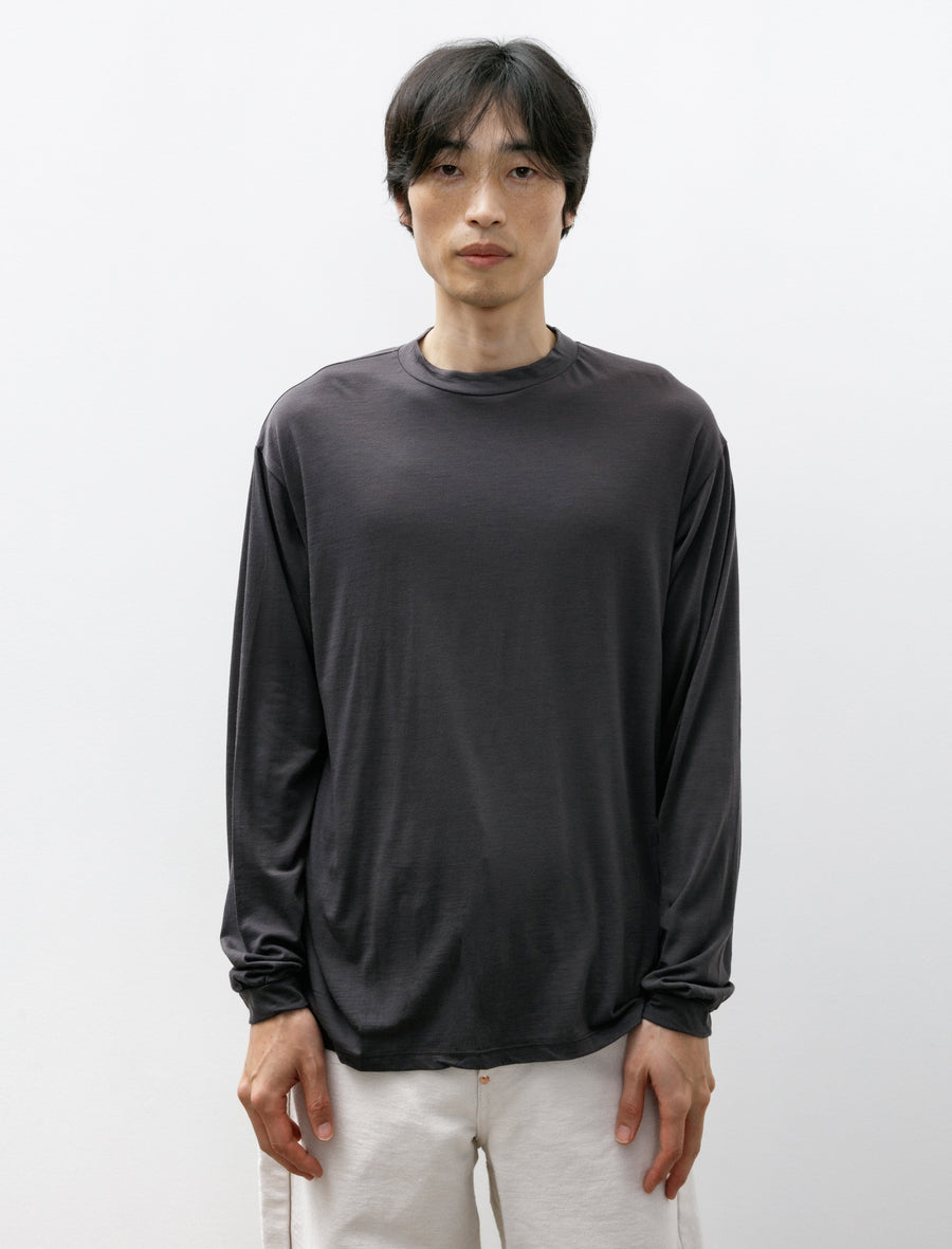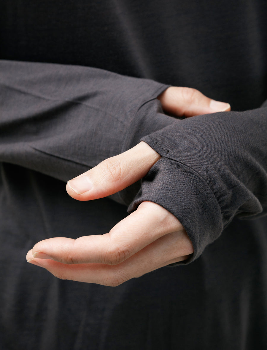 An easy, relaxed fitting base layer cut from a super lightweight technical merino wool jersey in a cool dull metal grey. The merino has been blended with nylon to improve durability while maintaining the moisture and odour control properties of the wool. Integrated thumbholes at the cuff provide additional warmth with more coverage while the generous silhouette combines with the jersey for lightweight functionality.