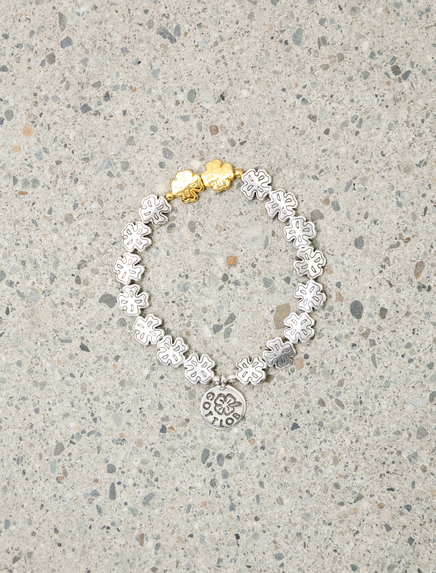 An elastic beaded bracelet featuring engraved, 999 silver plated "lucky charm" clover beads and two accent beads in 24k gold plating. Completed with a silver plated, engraved logo charm; the stretch of the elastic allows for some leeway in sizing depending on the desired fit.