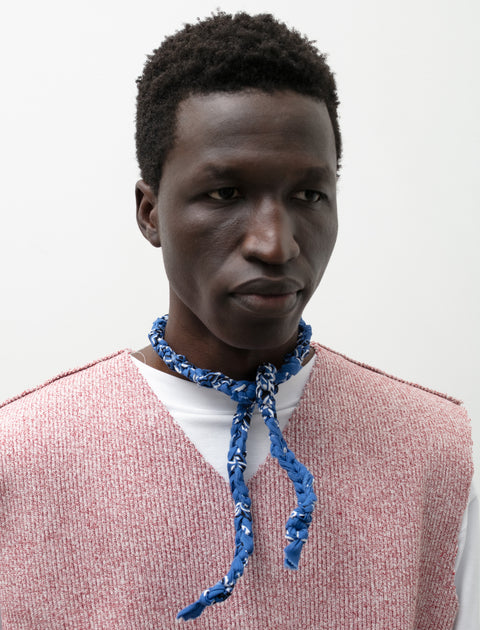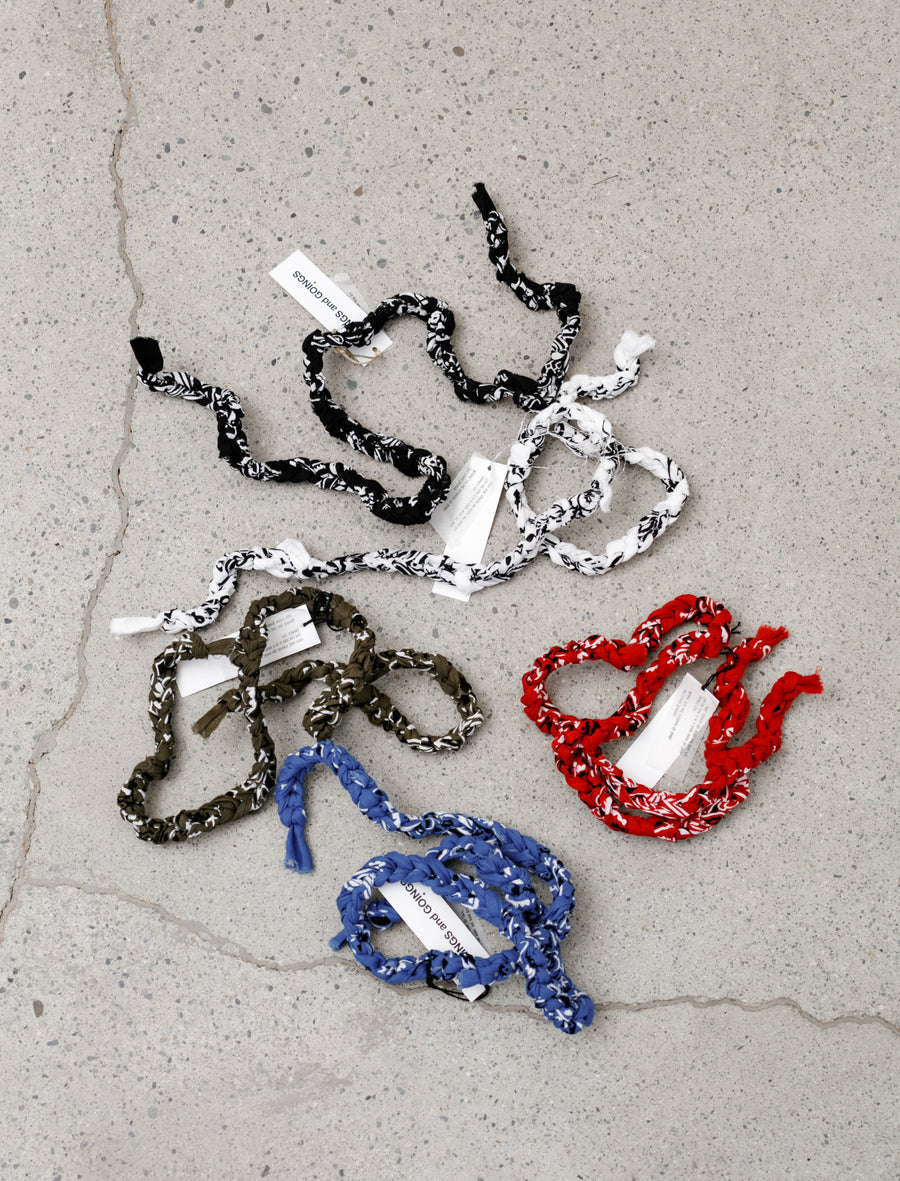 A new style from Hiro Yamamoto; a hand knotted paisley bandana. Made personally by Hiro in Vancouver, each bandana is first washed, hand-torn, and then knotted into a rope-like structure.