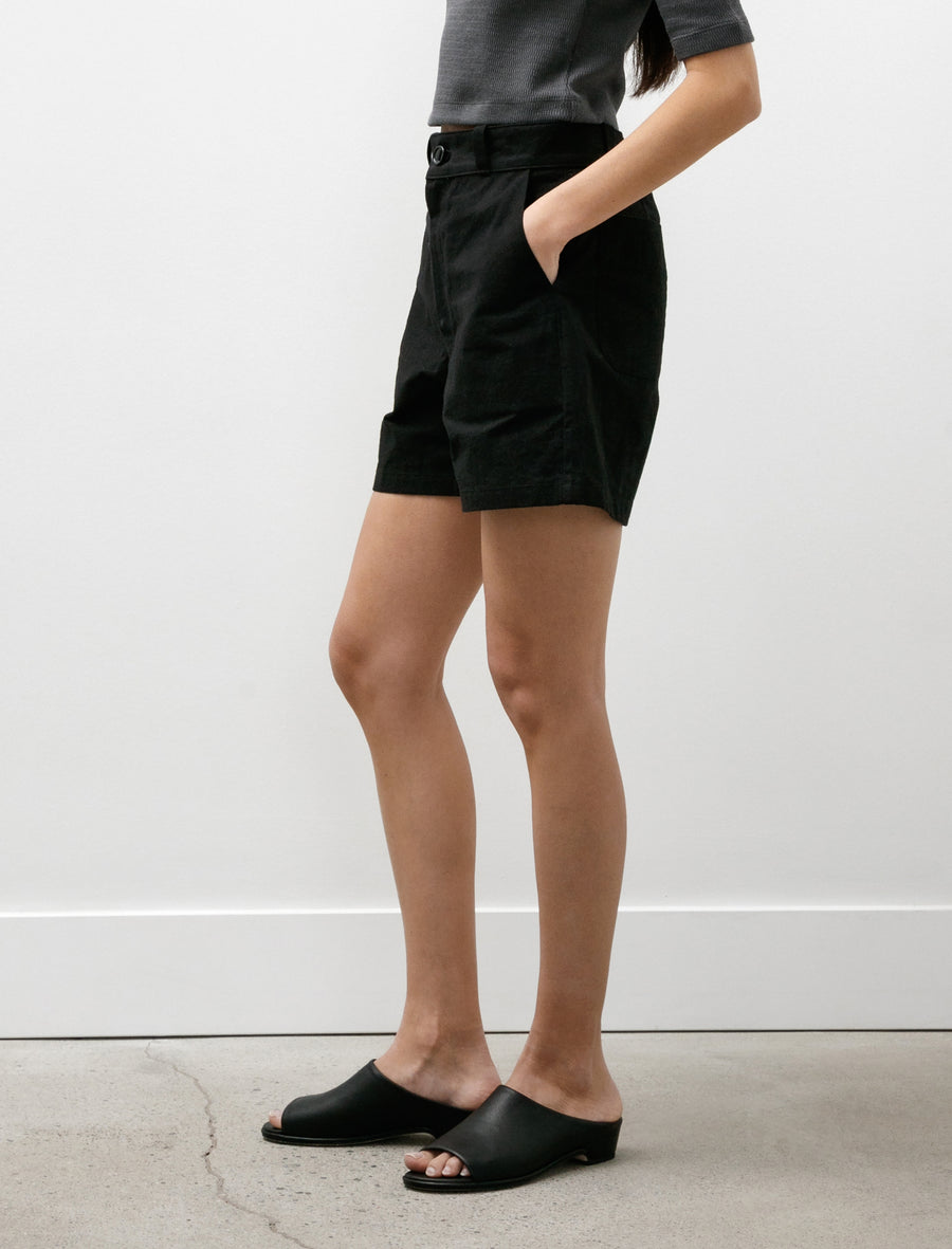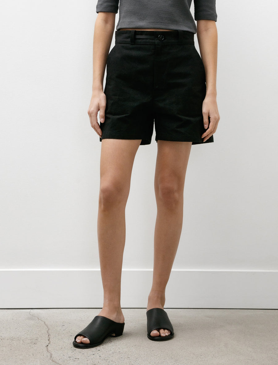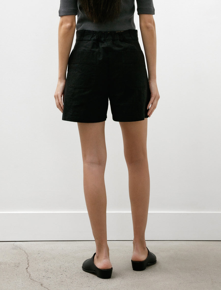 A refined take on everyday utility, these black high waisted shorts are a must-have for any warm weather wardrobe. Made of a yarn-dyed, high density cotton chambray with paraffin wax coating that is signature to MAN-TLE, the fabric will evolve beautifully over time– softening, fading, and developing unique variations with wear. The silhouette is high at the waist and wide through the thigh to provide ease of movement while maintaining a structured shape. An elastic gusset at the back of the waist ensures a comfortable fit, while side seam pockets and rear patch pockets add practicality. Finished off with the brand’s signature army button threaded onto car seat belt tape, these shorts offer durability and timeless style.