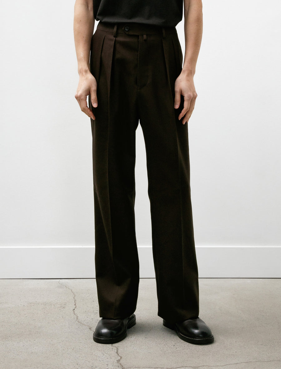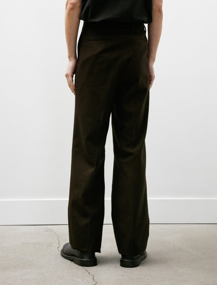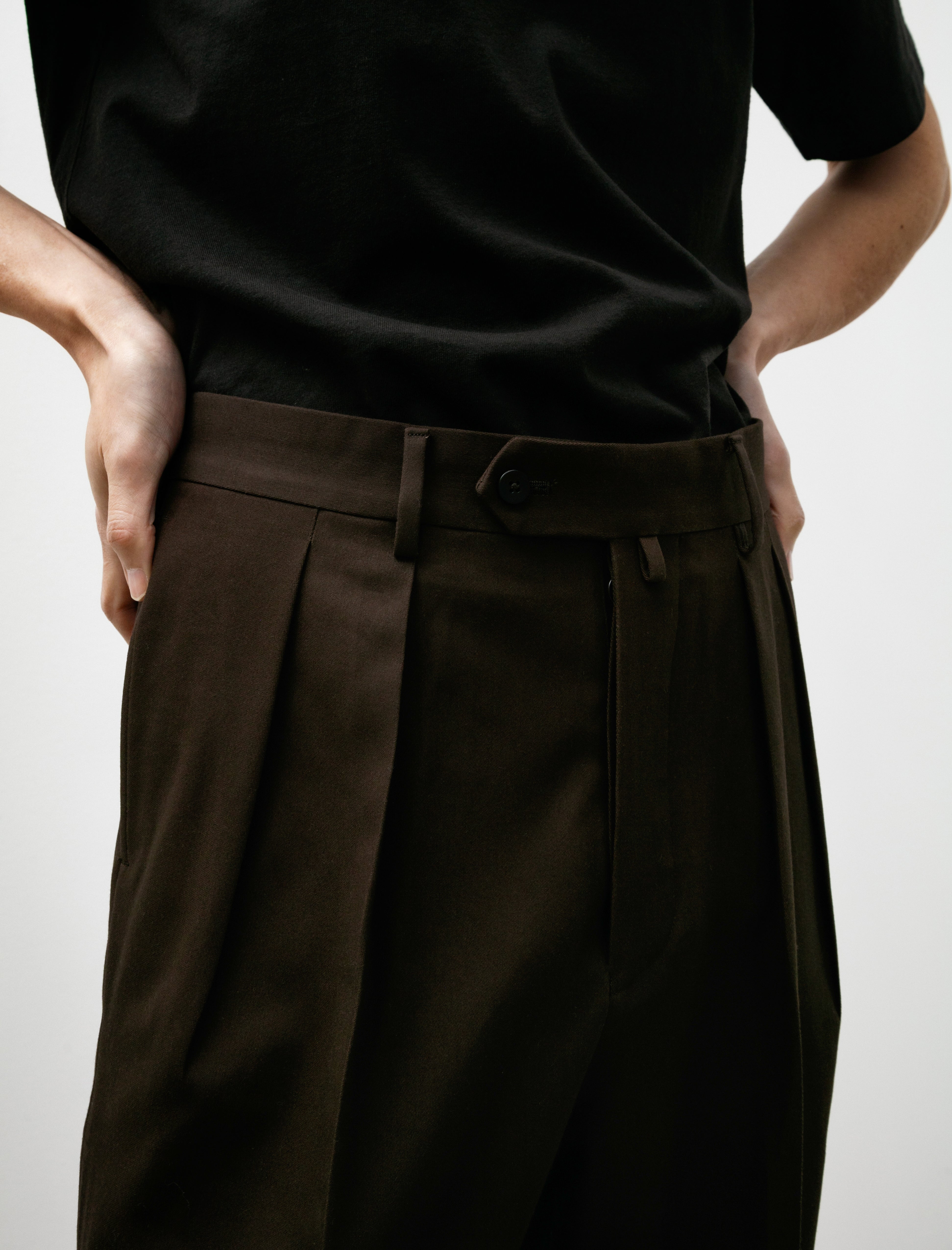 Relaxed fitting, long rise, flared trousers cut from a fine, smooth surfaced, hard twist cotton twill in a deep brown. Feature a three-point closure, a button fly, double pleating at the waist, front on-seam pockets, and rear welt pockets. A closer fit through the seat and thigh expands from the knee to produce a flared silhouette, evoking Italian tailoring and a sense of sophisticated ease. Constructed with additional seam allowance through the seat and inseam, allowing the silhouette to be adjusted for a perfect fit, and unfinished hems to be hemmed to the desired length; Corozo buttons.
