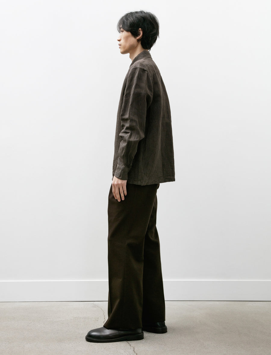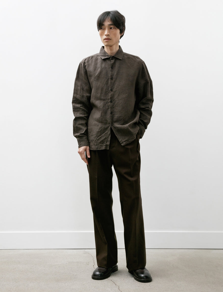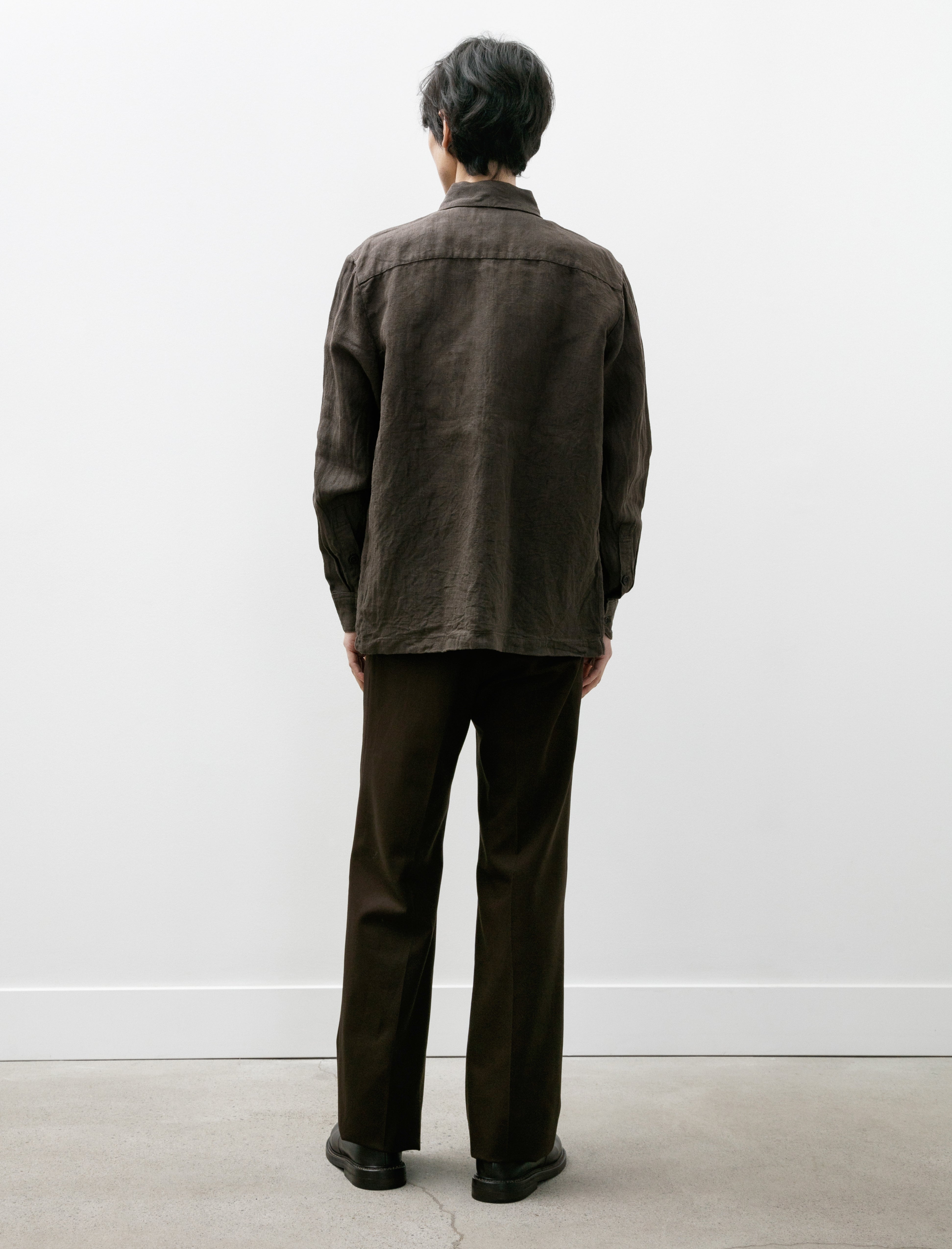 Relaxed fitting, long rise, flared trousers cut from a fine, smooth surfaced, hard twist cotton twill in a deep brown. Feature a three-point closure, a button fly, double pleating at the waist, front on-seam pockets, and rear welt pockets. A closer fit through the seat and thigh expands from the knee to produce a flared silhouette, evoking Italian tailoring and a sense of sophisticated ease. Constructed with additional seam allowance through the seat and inseam, allowing the silhouette to be adjusted for a perfect fit, and unfinished hems to be hemmed to the desired length; Corozo buttons.