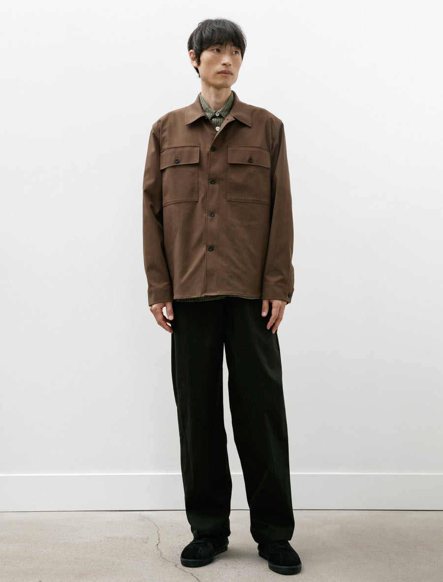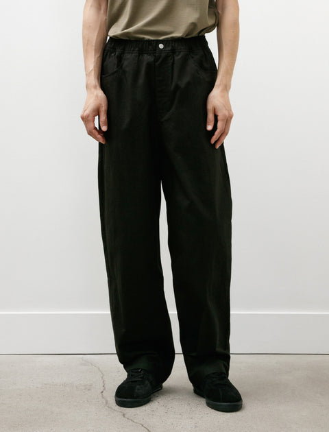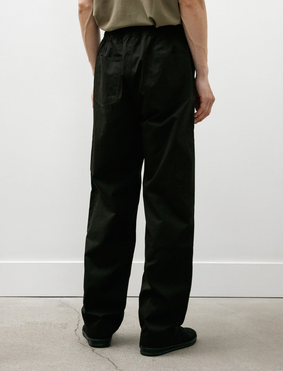 Relaxed fitting easy pants cut from a lightweight, fine, broken cotton twill in black. Feature an elastic waist with an internal drawstring, a zip fly, a snap closure, curved front slash pockets, and rear patch pockets. Roomy proportions through the seat and thigh are controlled with a gentle taper from the knee to produce a balanced, effortless everyday silhouette. Constructed using felled french seams through the seat and inseam for added durability at high stress points.