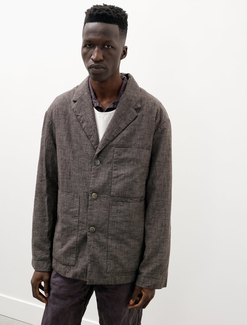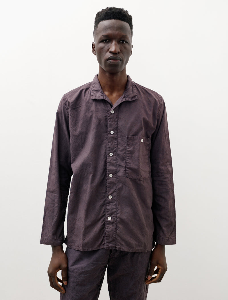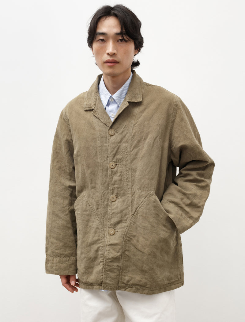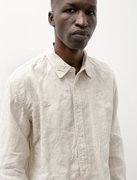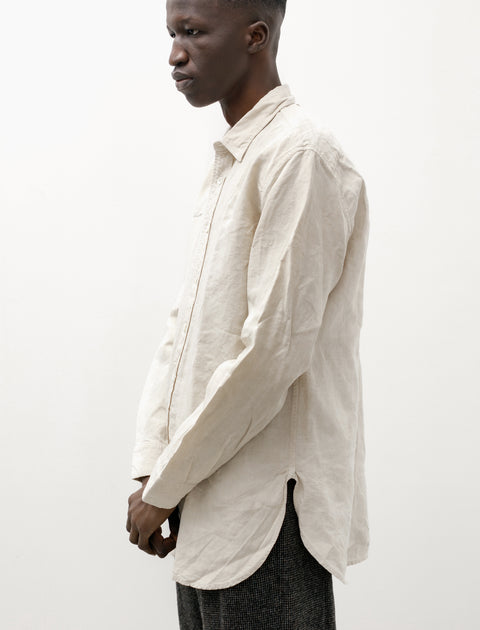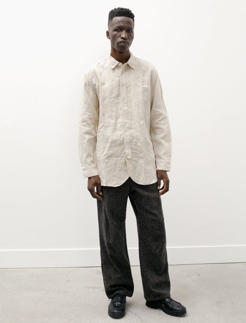 Built from heavy weight antique linen (100+ years old) this generously proportioned shirt will soften and darken with washing and wear. Features a strap style button placket that extends only to the end of the buttons. Clean finished two-piece yoke is constructed with contrasting Japanese cotton at the interior; moreover, a large box pleat at rear yoke. Split side seams are reinforced with hand-sewn gusset binding, and flat felled seams throughout.