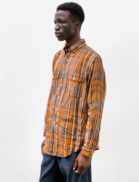 Orslow’s classic relaxed fitting safari shirt cut from a crunchy, yarn dyed, check linen shirting in mixed shades of orange. Features a button down collar, two breast pockets with flap button closures, and a two-piece clean finished yoke with a central box pleat. A wide body and a generous sleeve provide a controlled sense of volume without reaching excess and lend a relaxed feel. Constructed with Orslow’s trademark attention to durability using flat felled seams throughout for an elegant, durable finish that will last many years to come.